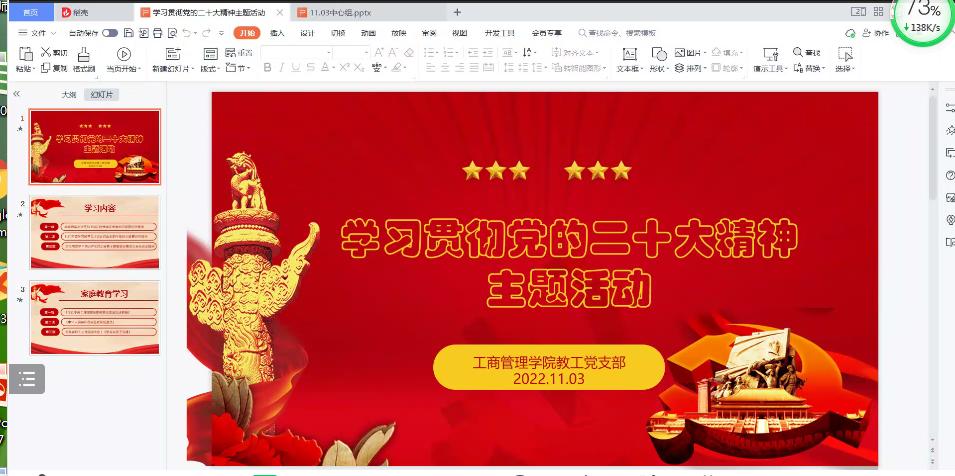 根据学校党委和学院党委的工作安排,2022年11月3日,beat365中文官方网站教工党支部在腾讯会议举行了学习贯彻党的二十大精神主题活动。