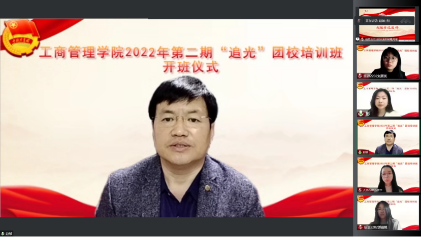2022年10月27日,beat365中文官方网站团员相聚在云端举办2022年第二期“追光”团校培训班开班仪式暨第一次课程培训,学院党委书记、团委书记及团校学员参加开班仪式。