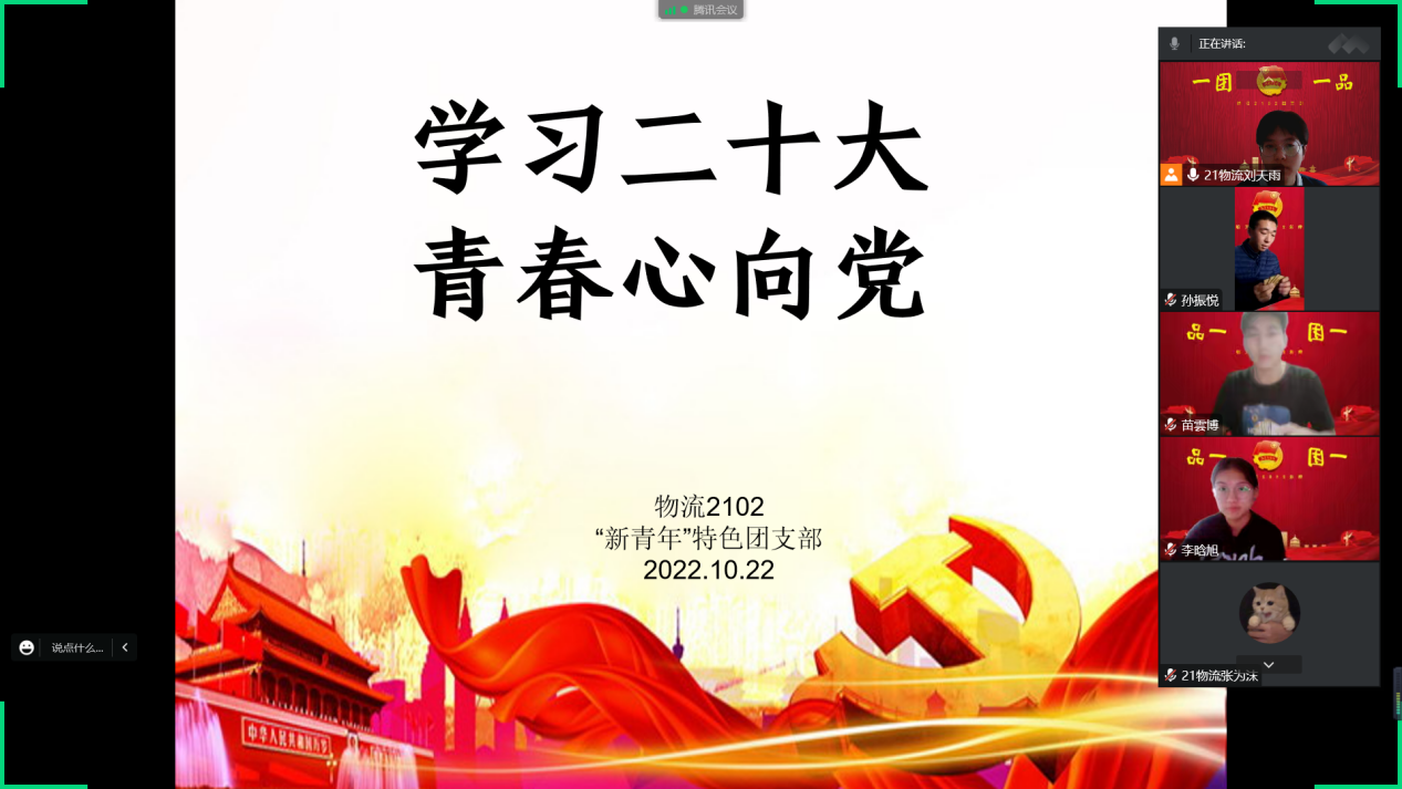 10月16日上午10时,中国共产党第二十次全国代表大会在北京人民大会堂隆重开幕。习近平总书记代表十九届中央委员会向大会作报告。beat365中文官方网站21级物流管理02“新青年”理论学习型“一团一品”特色团支部于10月22日下午两点半举办线上专题学习会。