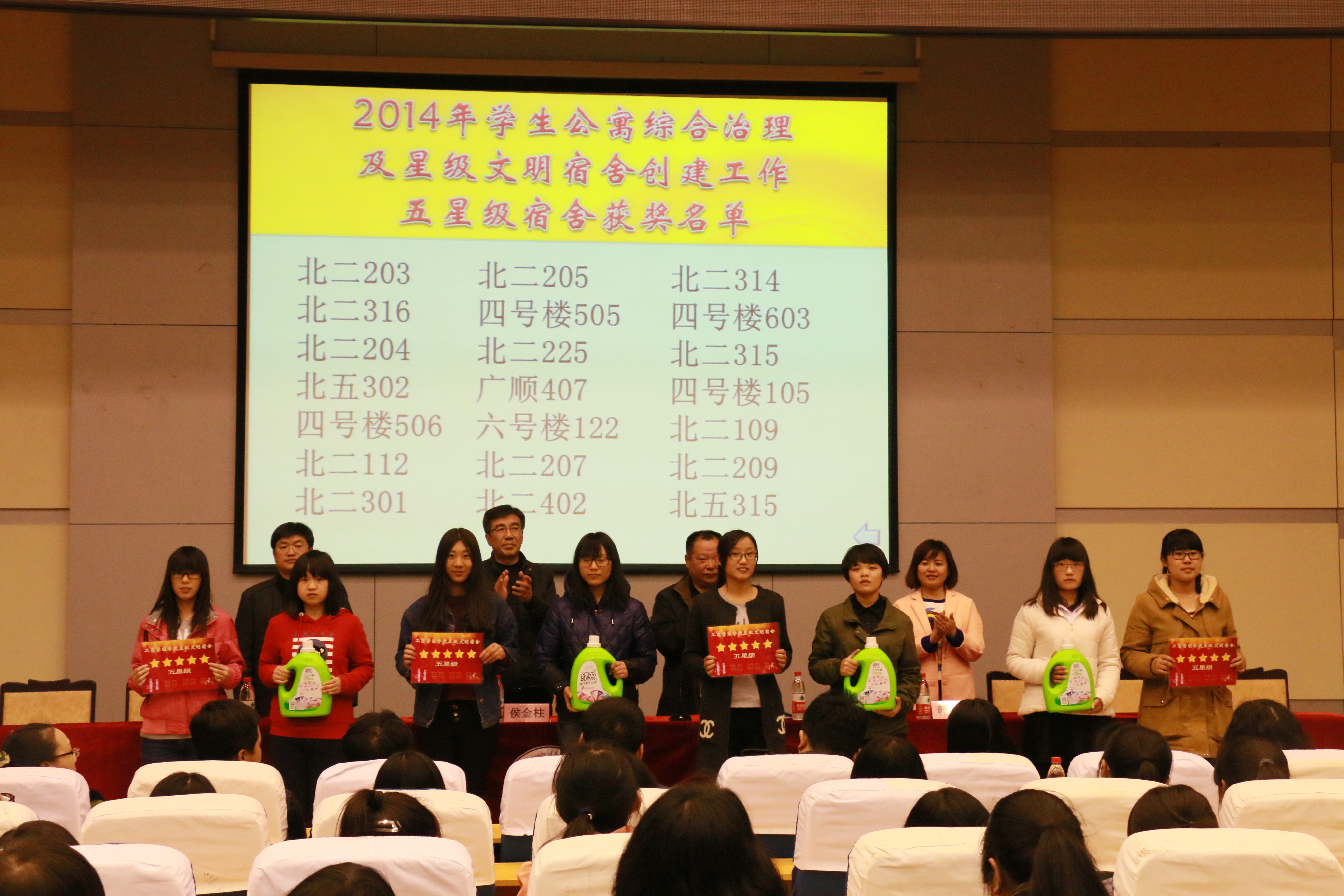 2015年4月7日晚七点,beat365中文官方网站在学术报告厅举行2014年学生公寓综合治理及星级文明宿舍创建工作表彰大会。出席本次大会的有学生处副处长徐树军,beat365中文官方网站党委书记侯金柱,党委副书记、副院长赵敏,以及全体辅导员和班主任老师。