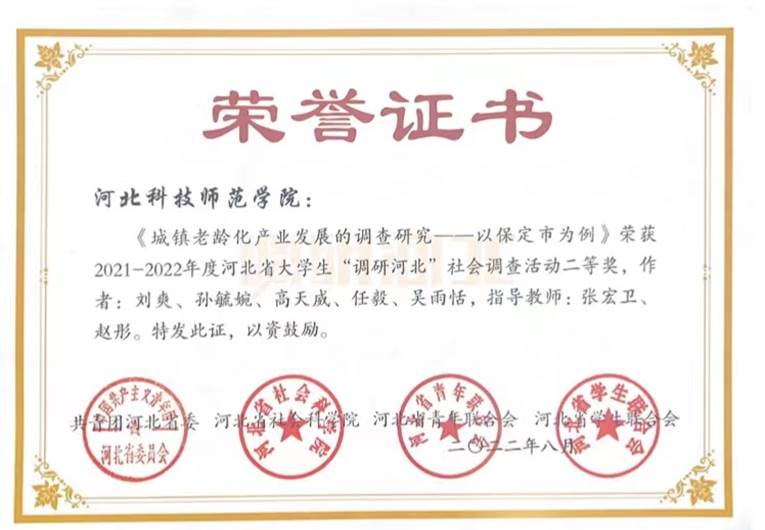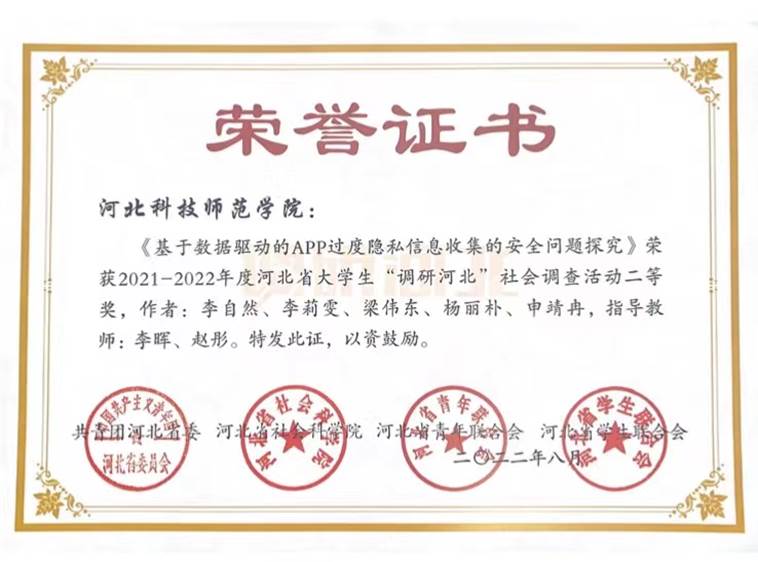近日,由团省委、省社科院、省青联、省学联共同组织的2021—2022年度河北省大学生“调研河北”社会调查活动评选已经结束,beat365官网作品《基于数据驱动的APP过度隐私信息收集的安全问题探究》(指导教师:李晖、赵彤)、《城镇老龄化产业发展的调查研究--以保定市为例》(指导教师:张宏卫、赵彤)分别荣获二等奖。