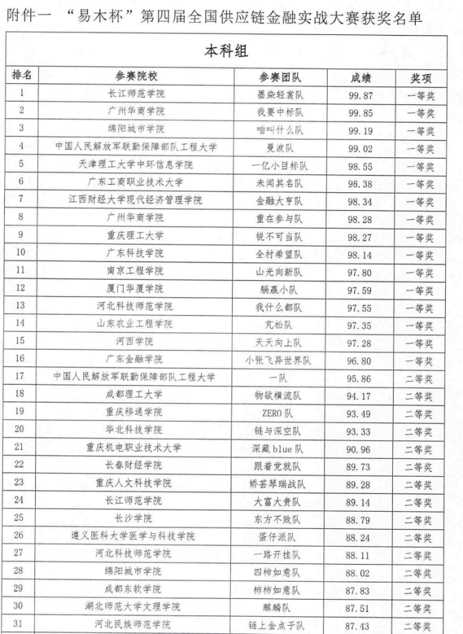 beat365中文官方网站学子在“易木杯”第四届全国供应链金融实战大赛中斩获佳绩,获本科组全国一等奖、二等奖各一项,职工组全国二等奖一项,两名教师获评“优秀指导教师”。