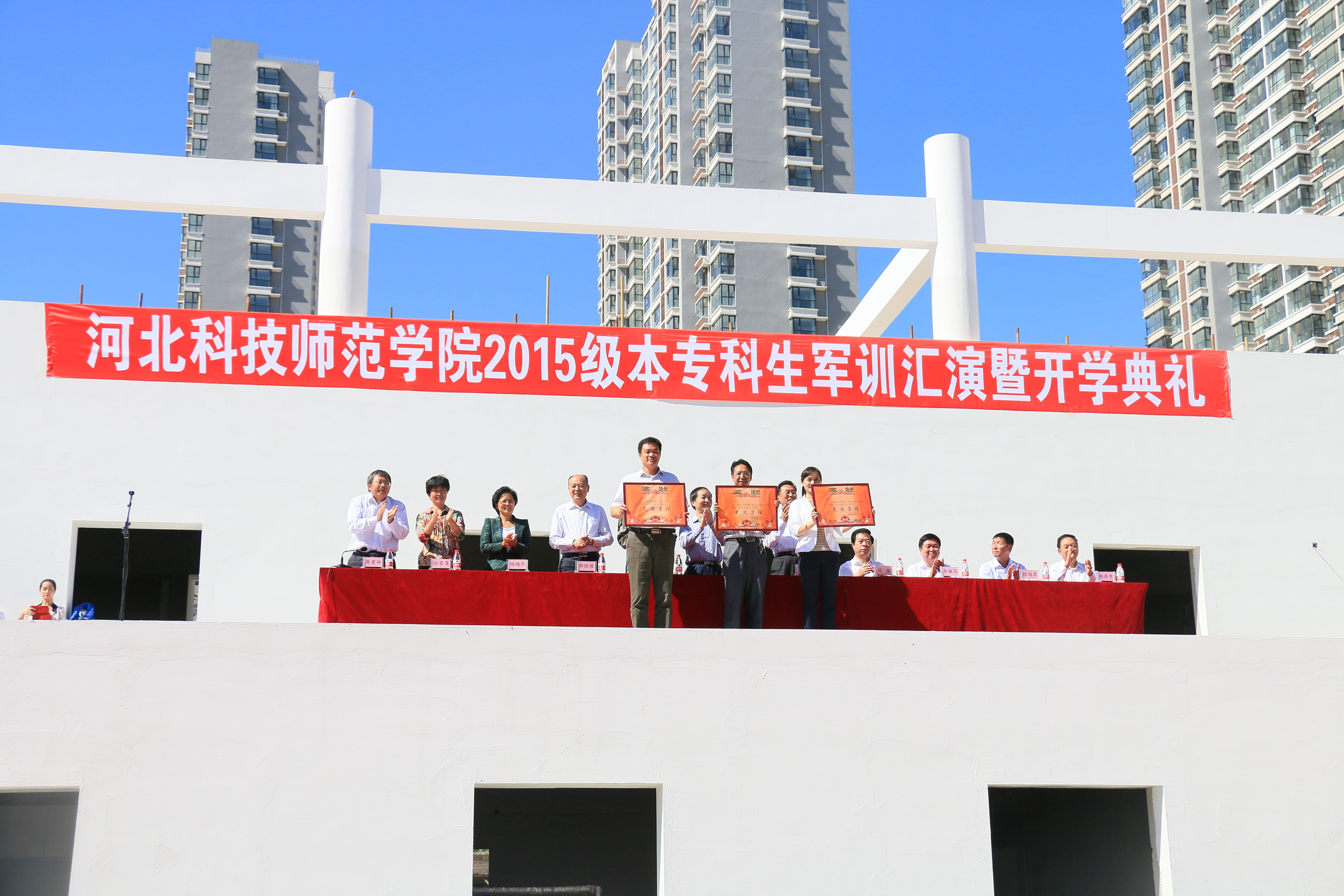2015年9月26日上午10:30beat365中文官方网站秦皇岛校区于后院操场举行2015级本专科生军训汇演暨开学典礼。